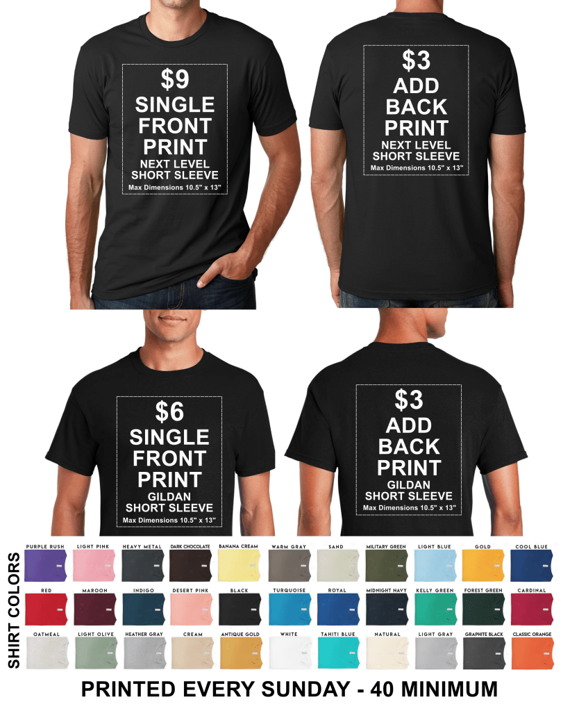 Mythic Merch will burn the screen of your design and send you a picture of it. Once you’ve received the picture of your screen payment in full is required before printing begins.